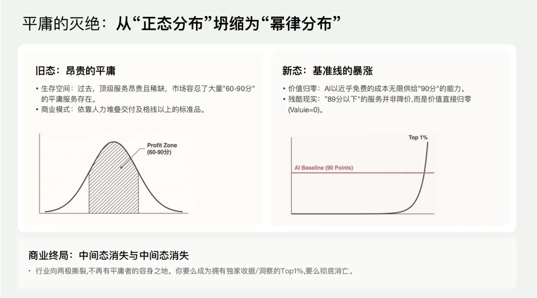 张帆老师抛出了一个让人冷汗直冒的反共识推演:“89分以下的服务并非降价,而是直接归零,你的价值没有任何价值了。”市场将向两端撕裂,你要么成为行业Top1%,要么就彻底消失。这就是大模型带来的——平庸的灭绝。