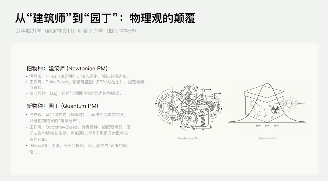 在这样的洪流下,产品经理的宿命将被彻底改写。“产品经理一定要从建筑师转变为园丁。”未来的PM不再是拿着线框图规定唯一正确路径的画图匠,而是要在不确定的概率边界中,用测试用例去“种”出一个生物态的产品。
