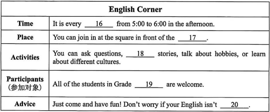 你将听到一则活动通知。请用你所听到的内容,填写表格中所缺单词,每空限填一词