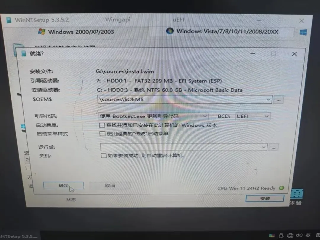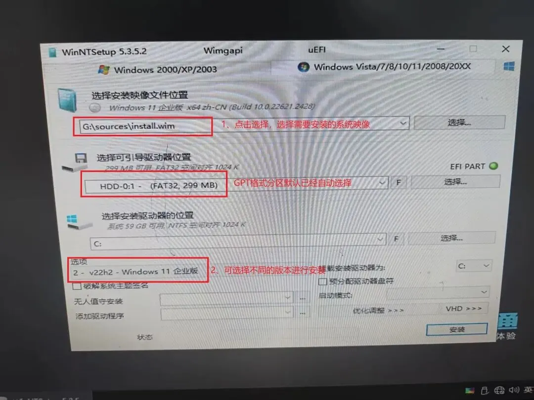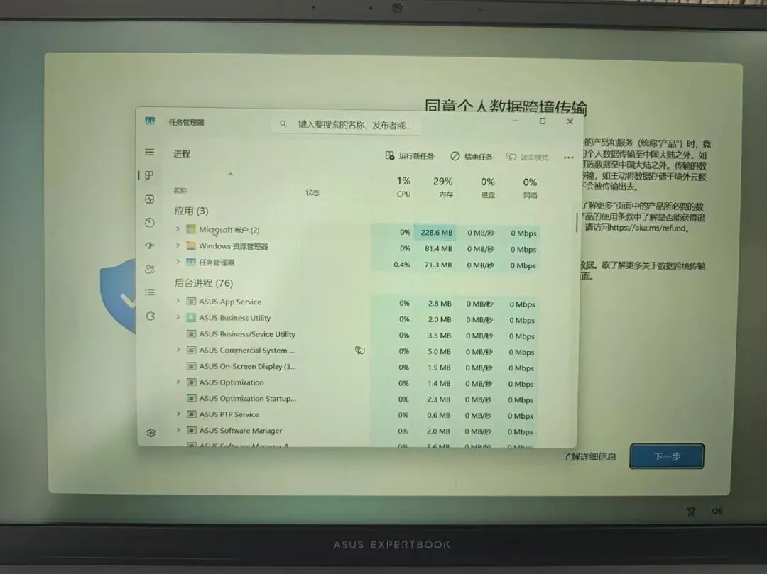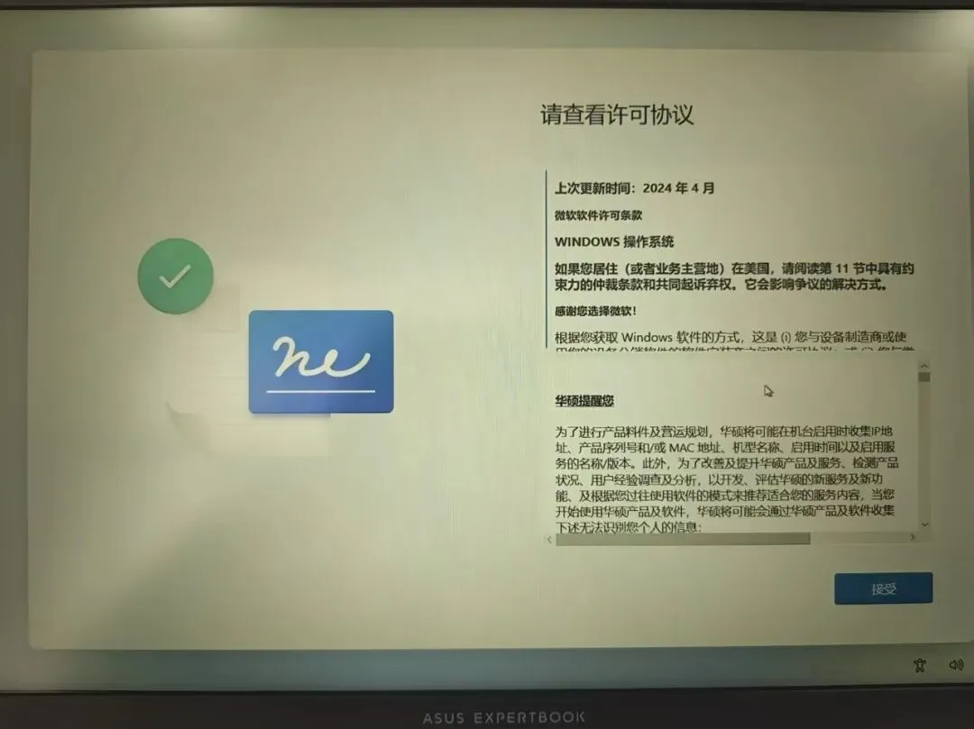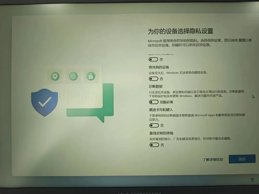 Windows 系统安装超详细教程,新手也能一次成功(安装篇) 在PE界面点击windows---程序---系统安装----WinNTSetup进入安装系统界面1、选择准备篇下载的系统镜像文件,引导驱动器位置默认已经配置好无需操作 点击确定系统将开始安装,等到达百分百之后,点击重新启动继续安装,这时可以将启动盘拔出(避免再次进入PE)。 进入安装阶段后,出现以上界面,选择国家(地区)点击是 这里要注意了,如果直接进入网络连接,那么就没办法创建本地账户,只能强制添加微软账户,邮箱和密码,否则无法进入系统。所以在这里我们要跳过网络连接。跳过连接方法如下:1、按键盘shift+F10,部分笔记本电脑需要按Fn+shift+F10,CMD界面后输入:OOBE\BypassNRO.cmd或者start ms-cxh:localonly需要注意有空格的地方,回车后机器会自动重启。 继续到添加网络的界面时,下面会出现我没有internet连接字样(不同版本可能会直接出现这个提示,如果有则直接跳过上一步骤),并点击。再点击“继续执行受限设置”。 到了这里大家要注意了,新版本系统基本上都会出现这样的霸王条款,如果不同意则没办法继续安装系统,可一但同意了你电脑内的信息和数据将有被第三方获取的风险。方法1、 Shift+F10+FN(部分笔记本电脑需要添加FN),再按 Win+R,输入 taskmgr 打开任务管理器;方法2、 Shift+F10+FN(部分笔记本电脑需要添加FN),再按ctrl+alt+del打开任务管理器; 将Microsoft 账户进程结束任务后,进入系统。虽然这方法能进入系统,但电脑重启后,又会再一次显示数据跨境传输提示。为了避免这个情况,我们必须彻底关闭这个提示。 进入系统后按win+E打开资源管理器,进入C:\WINDOWS\SYSTEM32,搜索WWAHost3、找到之前我们安装系统时添加的用户名,选中双击。2、将ALL APPLICATIONPACKAGES选中,并将权限全部选择拒绝3、删除ALL APPLICATIONPACKAGES以外的所有用户和组 如果是新采购的品牌电脑,出厂系统一般已预先激活并配备完整驱动,完成以上设置后,即可直接安装所需软件并正常使用。