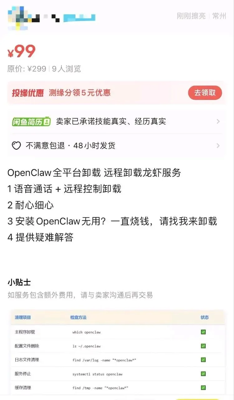 3月11日,二手交易平台上,“上门卸载OpenClaw”的服务如雨后春笋般涌现,报价从29元到299元不等。