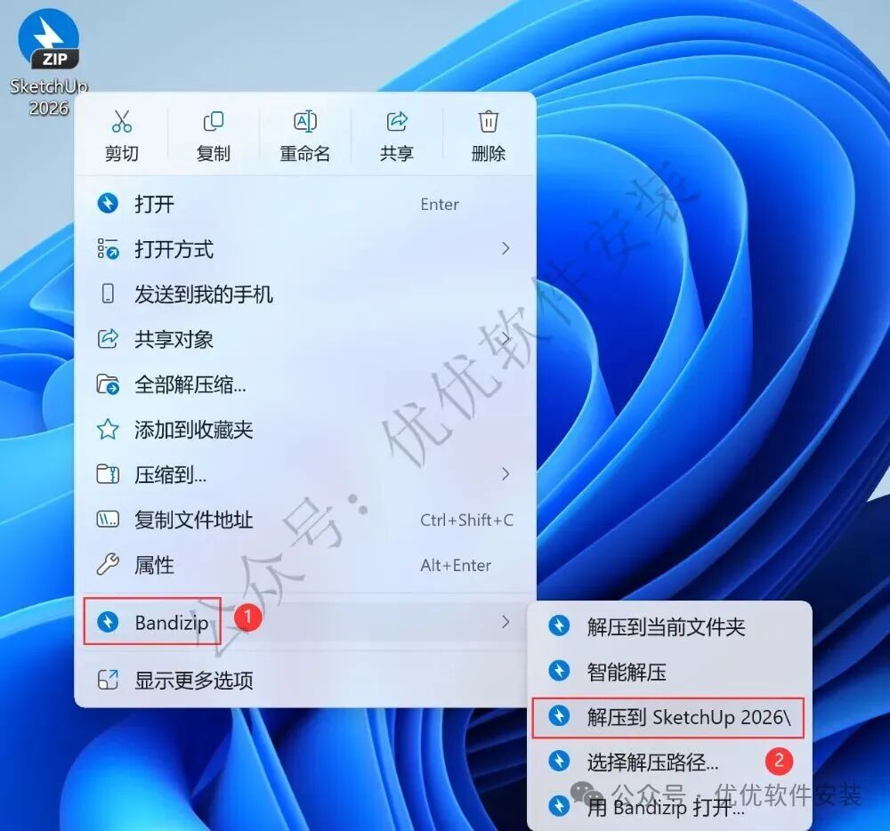 1、下载SketchUp 2026软件安装包到电脑上,右键选择【解压到SketchUp 2026\】