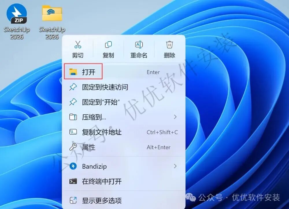 14、回到桌面,右键桌面上的【SketchUp 2026软件图标】,点击【打开】