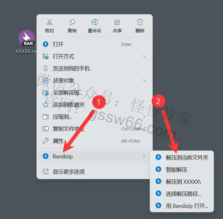 01,找到并选中下载好的“Photoshop 2019”压缩包,点击鼠标右键,点击压缩软件,点击“解压到当前文件夹”(获取压缩软件,公众号内发送:压缩软件)