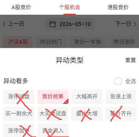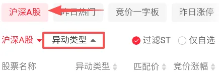 过滤ST,点开异动类型。试盘不试盘,我们看都不看,先看竞价抢筹。抢筹理解不?同花和通达对抢筹的定义还有点不一样,不过不重要。