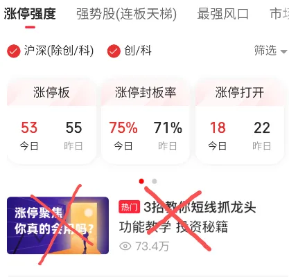 如果你不慎手痒点进去看了,就跟他说的反着来就对了。他要么就是胡说八道要么就是已经过时了。比如他说要涨停70家以上打板,你就70家以下买入,70家以上卖出空仓。总之,就是反人性,不要和那些小白为伍,你的胜率会大很多。连板天梯和最强风口肯定还是可以看看的,自己独立判断。千万不要信他们的解读,他说的再有道理,用的人多了就会亏钱。自己去研究,日积月累才能熟能生巧,这个我帮不了你。