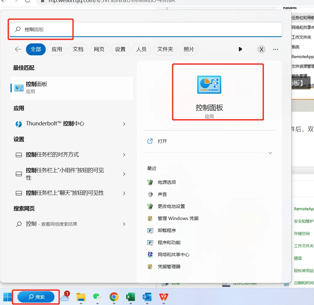 步骤1:在电脑桌面左下角【搜索框】中输入【控制面板】,点击打开。