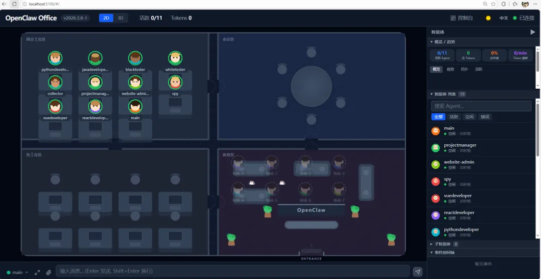 🪑 工位区——Agent的标准工位 🪺 临时工位——弹性座位 🚪 会议区——多人协作空间 🪑 各种家具——细节拉满