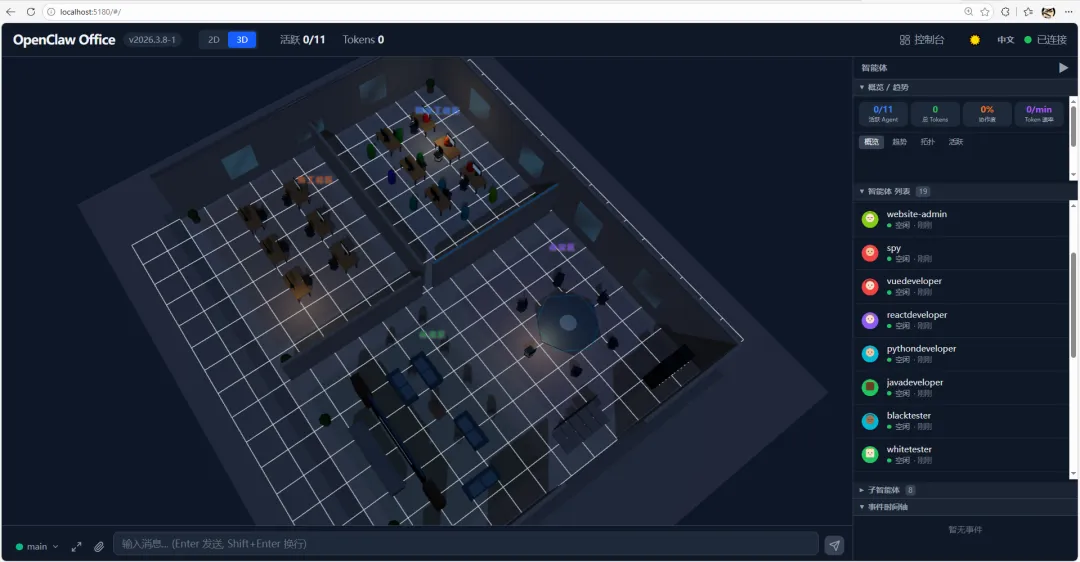 通过等距投影风格的虚拟办公室场景,实时展示Agent的工作状态、协作链路、工具调用和资源消耗