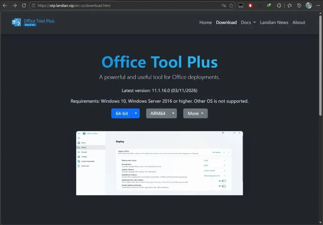 保姆级教程|用OfficeTools一键下载安装MSOffice,新手零踩坑不管是学生党写论文、做PPT,还是打工人做报表、编辑文档,Office都是离不开的办公神器。但很多人都不知道怎么正确安装Msoffice而去用WPS,被WPS的广告等深受其害。PS.WPS的网盘还会使你的CPU占用率高。 今天就给大家分享一个超省心的解决方案:用「OfficeTools」一键搞定Office的下载、安装和激活,全程可视化操作,新手也能跟着一步到位,再也不用到处找资源、踩坑走弯路! 先跟大家科普下:OfficeTools(全称Office Tool Plus)是一款安全免费的Office部署工具,它不捆绑任何垃圾软件,直接调用微软官方接口,能下载纯净版Office所有版本,还能自定义安装组件、一键激活,比官网操作更简单,比第三方工具更安全可靠。 重点:它是绿色软件,无需安装,解压就能用,用完直接删除文件夹即可,不会占用多余系统资源,也不会留下垃圾文件✅ (亲测安全,无病毒、无捆绑,大家可放心使用) 准备工作(1分钟搞定) 在开始操作前,先做好2个小准备,避免安装过程中出现报错: 确保电脑联网:下载和安装过程需要联网,建议连接稳定的WiFi,避免中途断网导致安装失败。 预留足够空间:Office基础三件套(Word+Excel+PPT)约需2-3GB空间,完整版约需5-8GB,提前清理C盘或安装盘空间即可。 步骤1:下载OfficeTools(附安全下载渠道) 很多人找不到正规的OfficeTools下载渠道,这里给大家整理了安全可靠的方式,避免下载到恶意版本: 打开浏览器(建议使用Edge或者Chorme),使用Bing搜索引擎( https://cn.bing.com/ )搜索「Office Tool Plus 官网」(认准官网域名:officetool.plus)。为了方便大家,笔者这里给出下载链接( https://otp.landian.vip/en-us/download.html ) 进入官网后,点击蓝色64Bit按钮,开始下载64位软件。如果下载速度慢可以使用IDM,NDM等下载器。这里笔者提供夸克盘下载链接(https://pan.quark.cn/s/b03fd7557310 ) 下载完成后,会得到一个压缩包(后缀为.zip或.rar),保存到桌面或容易找到的文件夹,方便后续操作,建议使用bandizip或者7zip解压。 步骤2:运行OfficeTools OfficeTools是绿色软件,无需安装,解压后即可直接运行,步骤超简单: 解压完成后,打开解压后的文件夹,找到「Office Tool Plus.exe」文件,右键,选择以管理员身份运行; 首次打开时,系统可能会弹出「用户账户控制」提示,点击「允许」即可;如果杀毒软件提示风险,选择「信任」(OfficeTools有数字签名,由已验证发布者开发,安全无风险); 打开后会进入软件主界面,界面简洁明了,左侧是功能导航栏,右侧是操作区域,新手也能快速上手。 步骤3:用OfficeTools下载+安装Office(核心步骤) 这一步是重点,全程可视化操作,可自定义安装版本和组件,避免安装不需要的软件(比如Outlook、OneNote),节省电脑空间: 进入部署页面:点击左侧导航栏「部署」,进入Office下载安装配置界面; 部署模式选择【下载】,更新通道选择适当即可,创建桌面快捷方式可选可不选。 添加产品(选择Office版本):点击右侧「添加产品」,在弹出的窗口中,选择自己需要的Office版本(新手推荐「Office 2024专业增强版」或「Office 365」) 自定义安装组件:添加产品后,下方会显示所有Office组件(Word、Excel、PPT、Outlook等),取消勾选不需要的组件,只保留自己常用的(比如只留Word、Excel、PPT三件套)。 选择语言:点击右侧「添加语言」,在弹出的窗口中,在最下方找到「简体中文」,勾选后点击「确定」。 最后把界面拉到最上方,点击开始部署。此时,下方会显示进度条,耐心等待下载完成。 步骤4:一键激活Office(永久可用) 安装完成后,Office还处于未激活状态,打开会提示「激活失败」,用OfficeTools就能一键激活,无需额外找激活码: 回到OfficeTools主界面,点击左侧导航栏「激活」; 先点击「清空所有Office许可证」,确保之前的残留许可证被清除; 打开OfficeTools官网,点击右上角「新手教程」,找到「激活Office」板块,根据自己安装的Office版本(如Office 2024),复制对应的激活命令( https://blog.yerong.org/archives/14 ); 回到OfficeTools激活界面,按下键盘「Ctrl+Shift+P」,弹出命令窗口,粘贴刚才复制的激活命令,点击「确定」; 如果你安装了 Microsoft 365,或者你只是单纯地在遵循教程的指示,请使用以下代码进行激活: