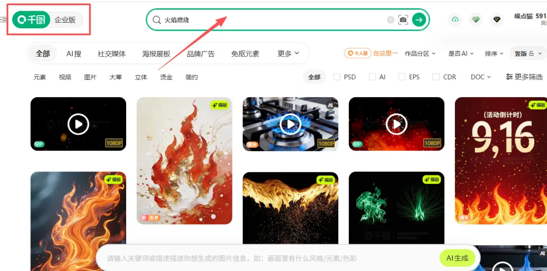 进入千图网后,我没有直接在首页大范围地看,而是直奔主题。在顶部的搜索框里,我先输入了核心关键词“火焰”,然后在分类里直接筛选出“视频”这一项。第一轮搜索结果出来后,内容非常多,有真实的篝火,也有特效火焰。