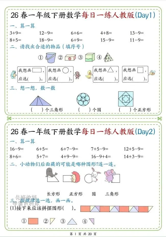 今天给大家整理了26春一年级数学人教版下册每日一练,转发给朋友或班级群,受益更多人,帮助孩子学习!