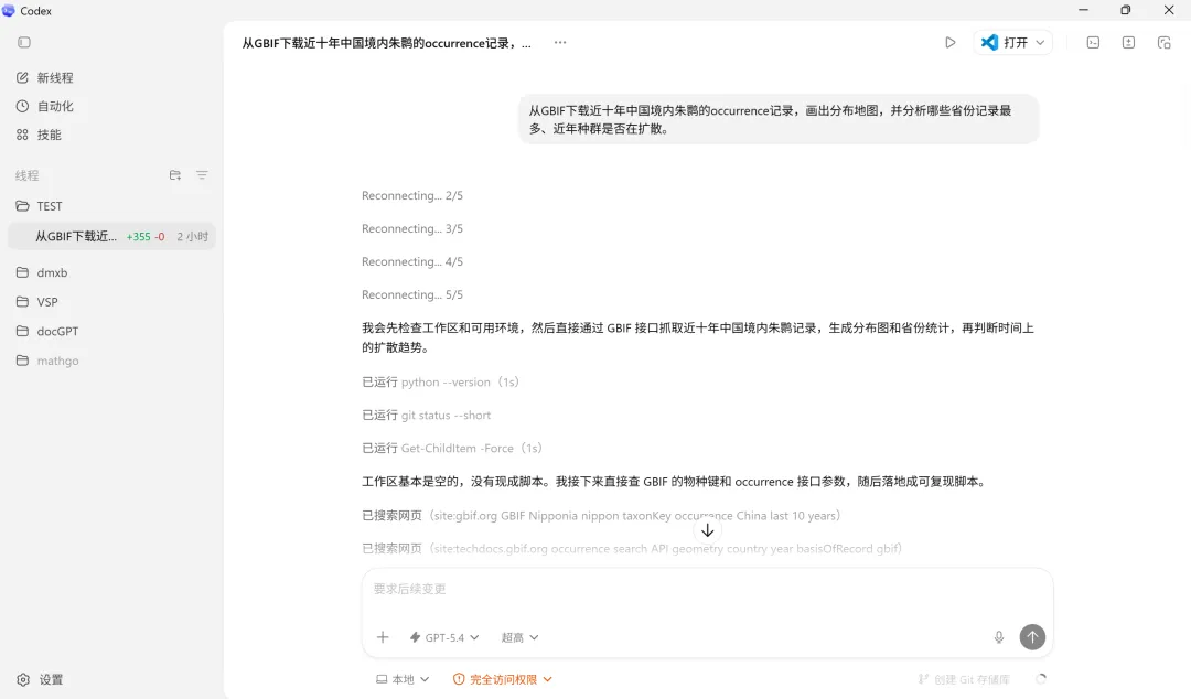 我盯着屏幕想了一会儿。这个流程我自己走一遍,从pygbif到geopandas到matplotlib,保守估计半天。