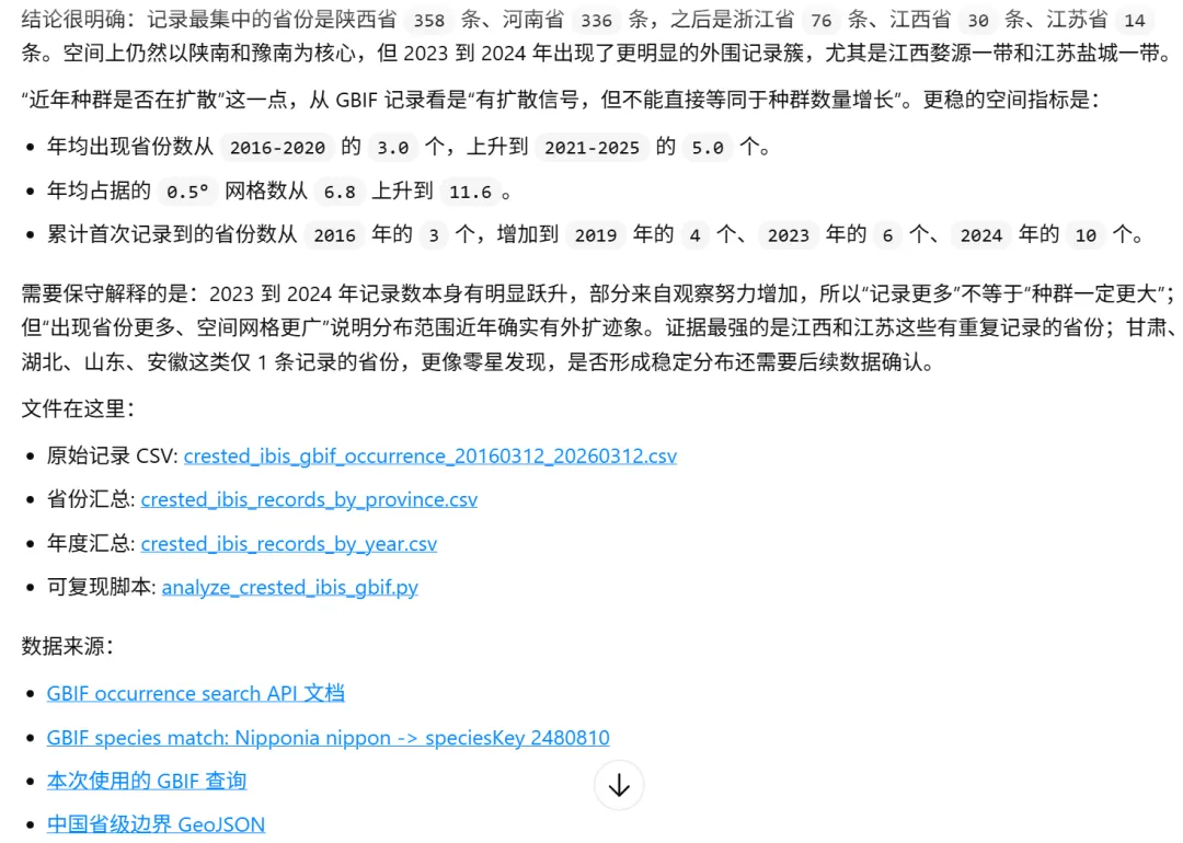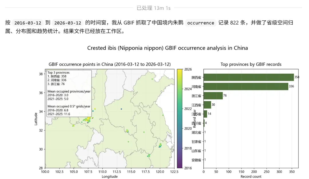 朱鹮这个案例能跑出来,不是因为工具多强,是因为那句prompt写得足够清楚——物种名、数据源、地理范围、时间窗口、分析目标,每个要素都在。把问题问清楚,工具自然会处理剩下的。