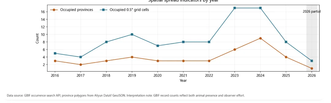 原始occurrence记录 CSV(822条,经GBIF API实时拉取,speciesKey: 2480810) 省份汇总表、年度汇总表 一张带省级polygon的分布点图,点色按年份渐变 逐年空间扩散指标图(occupied provinces + occupied 0.5° grid cells双轴) 可复现的Python脚本(+355行) 一段附有方法论注释的文字结论