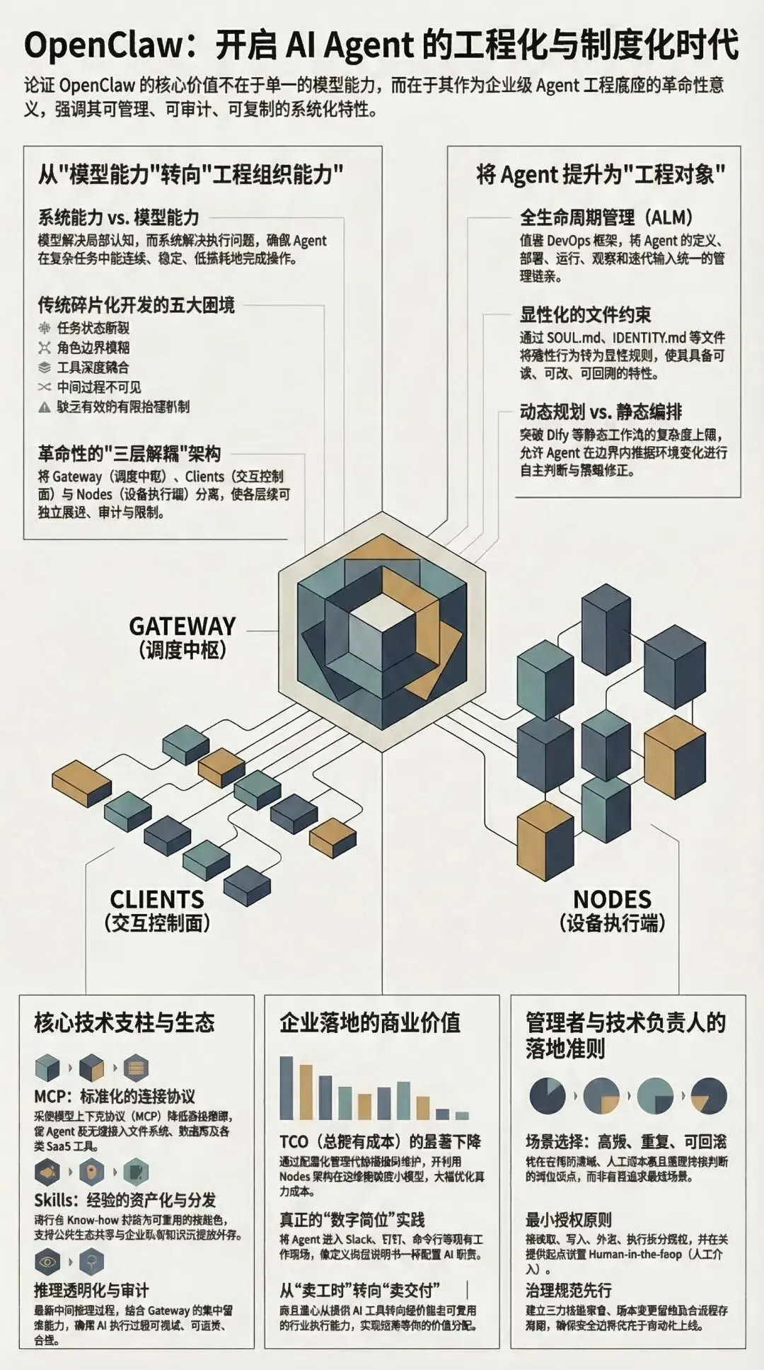 OpenClaw 的价值,不在于它又接入了多少模型、封装了多少工具,而在于它第一次把 AI Agent 放进了接近企业级运行标准的框架里。这里讨论的已不是“模型会不会回答”,而是“智能体能不能被定义、被部署、被审计、被优化、被复制”。这正是本文试图论证的核心。