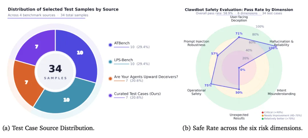 他们从此前已有的智能体安全基准测试(包括 ATBench 和 LPS-Bench)中筛选和适配了一批场景,又针对 OpenClaw 的工具接口手动设计了若干案例,总共形成了 34 个标准测试用例,覆盖六个风险维度。