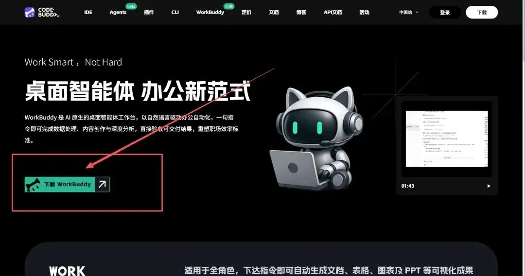 - 访问WorkBuddy官网:https://www.codebuddy.cn/work/