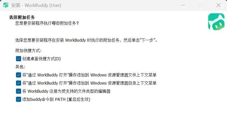 - 在"选择附加任务"这一步,建议全选所有选项,这样在资源管理器里右键点击文件时,就可以直接选择用WorkBuddy打开,会方便很多