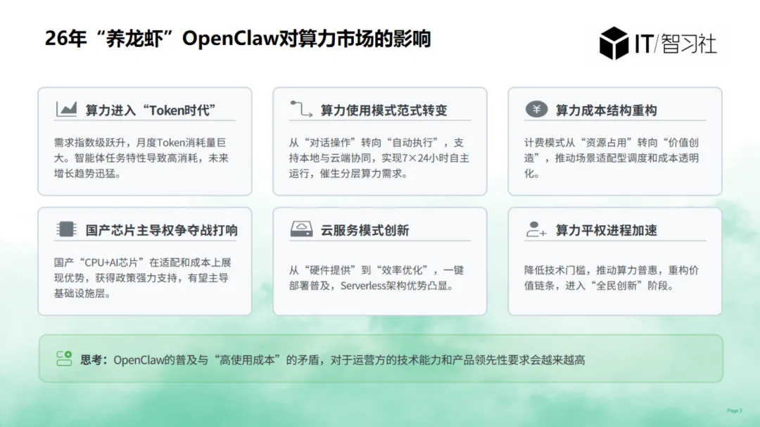 OpenClaw 是本地优先、模型无关的 AI 智能体执行框架,核心是让大模型从 “对话” 走向 “自主执行”,并以分布式超节点架构实现规模化、高可靠的任务调度。它直接推动 AI 从交互层进入执行层,重塑算力需求、应用形态与产业格局。