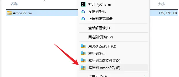 1.解压安装包:鼠标右击【Amos29】压缩包,选择电脑上安装的解压软件,点击解压到【Amos29】。