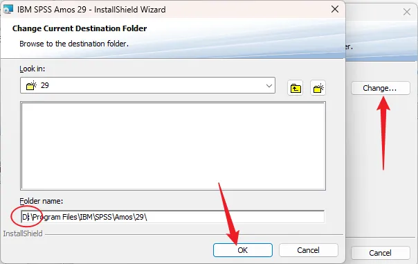 6.①点击【Change……】;②修改路径地址的C可更改安装位置(如:将C改为D);③点击【OK】。