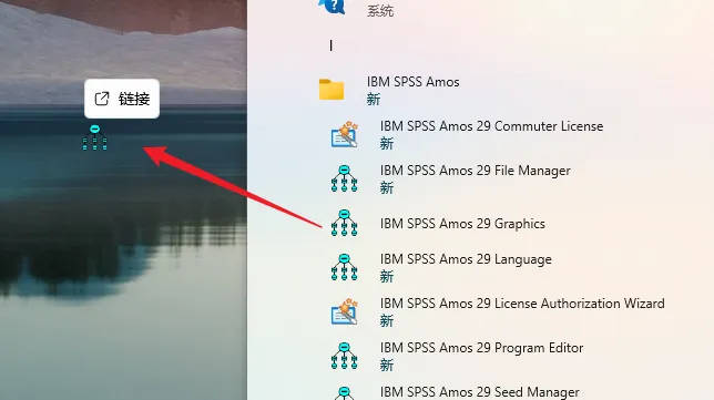 13.创建桌面启动快捷方式:点击桌面左下角【开始】图标—【所有应用】,在菜单栏中找到并拖动【IBM SPSS Amos 29 Graphics】图标到电脑桌面。