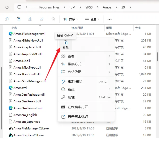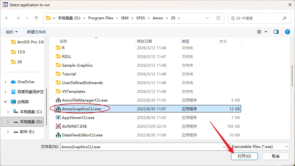 19.打开步骤10修改的软件安装路径【D:\Program Files\IBM\SPSS\Amos\29】并选中【Amos GraphicsCLI】,点击【打开】。