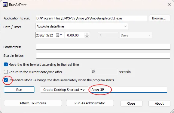 20.生成软件启动的桌面快捷方式:①勾选【Immediate Mode...】②输入【Amos 29】③点击【Create Desktop...】。