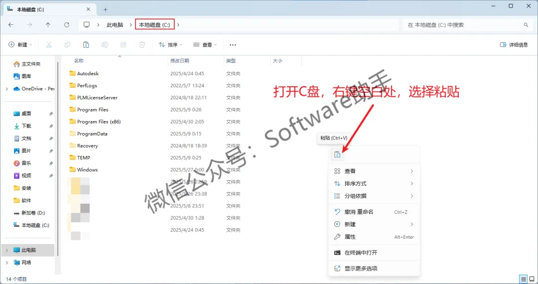 8.打开电脑C盘,鼠标右键空白处,选择【粘贴】
