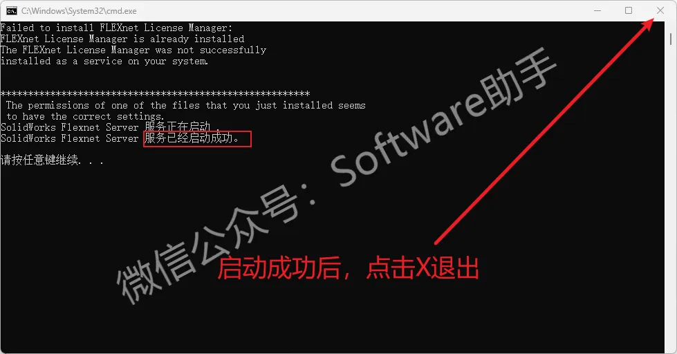 11.界面提示“服务已经启动成功”后,点击右上角【X】关闭