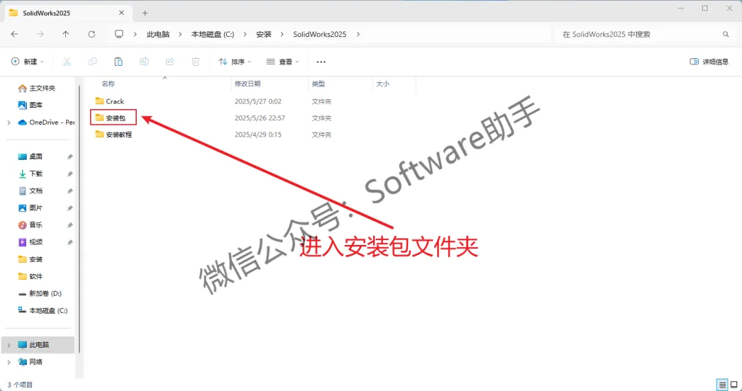 12.回退到【SolidWorks2025】文件夹,再进入【安装包】文件夹