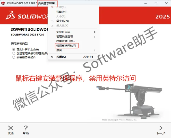 14.鼠标右键窗口上面的【安装管理程序】字体,选择【禁用英特尔访问】