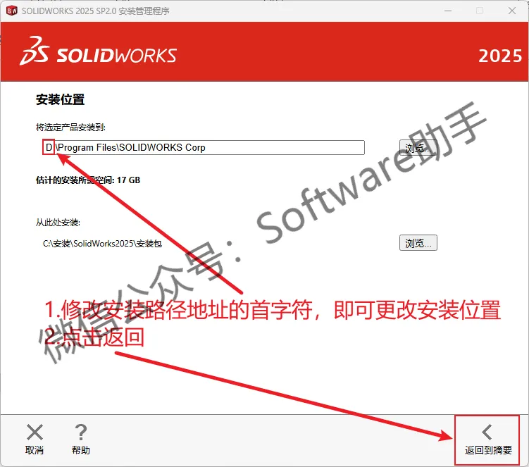 18.修改路径地址中的第一个字符C可更改安装位置(如:把C改为D,则软件将安装到D盘,记住修改后的磁盘,后面的步骤会用到),点击【返回摘要】