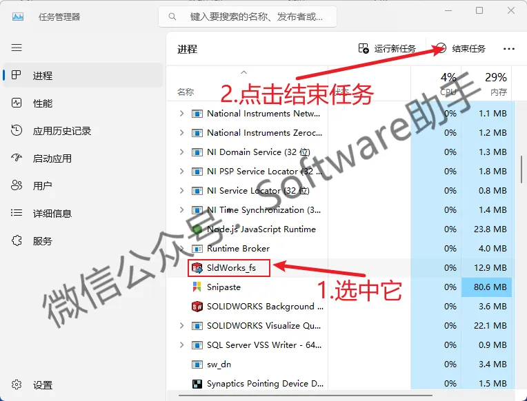 29.在键盘上同时按住“ESC+Shift+Ctrl)”键打开任务管理器,,鼠标右击【sldworks_fs】选择【结束进程】