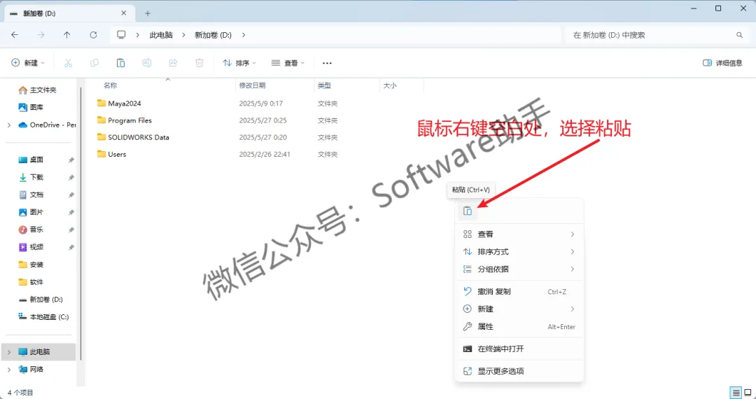 31.打开步骤18修改的磁盘(如:D盘,我在步骤18将C改为了D),鼠标右键空白处,选择【粘贴】
