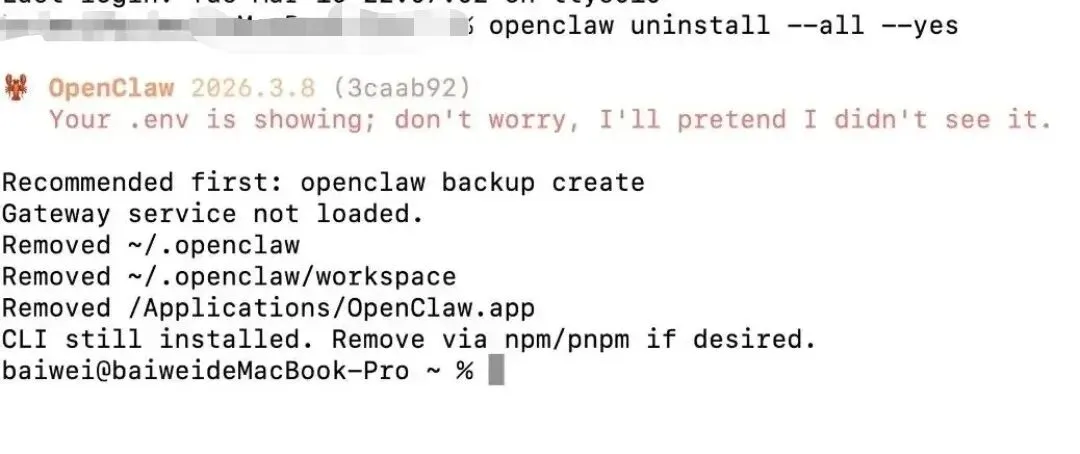 上面的指令跑完后,你的电脑里就只剩下 OpenClaw 的外壳(CLI 工具)了。如果你想把它也彻底送走,再执行一行代码块:npm uninstall -g openclaw。