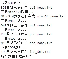 function download_all_climate_indices()% 下载所有气候指数到当前文件夹%% 1. 下载SOI数据fprintf('下载SOI数据...\n');url_soi = 'https://psl.noaa.gov/data/correlation/soi.data';trydata_soi = webread(url_soi);fid = fopen('soi_noaa.txt', 'w');fprintf(fid, '%s', data_soi);fclose(fid);fprintf('SOI数据已保存为 soi_noaa.txt\n');catchfprintf('SOI下载失败\n');end%% 2. 下载Nino3.4数据fprintf('下载Nino3.4数据...\n');url_nino = 'https://psl.noaa.gov/data/correlation/nina34.data';trydata_nino = webread(url_nino);fid = fopen('nino34_noaa.txt', 'w');fprintf(fid, '%s', data_nino);fclose(fid);fprintf('Nino3.4数据已保存为 nino34_noaa.txt\n');catchfprintf('Nino3.4下载失败\n');end%% 3. 下载ONI数据fprintf('下载ONI数据...\n');url_oni = 'https://psl.noaa.gov/data/correlation/oni.data';trydata_oni = webread(url_oni);fid = fopen('oni_noaa.txt', 'w');fprintf(fid, '%s', data_oni);fclose(fid);fprintf('ONI数据已保存为 oni_noaa.txt\n');catchfprintf('ONI下载失败\n');end%% 4. 下载PDO数据fprintf('下载PDO数据...\n');url_pdo = 'https://psl.noaa.gov/data/correlation/pdo.data';trydata_pdo = webread(url_pdo);fid = fopen('pdo_noaa.txt', 'w');fprintf(fid, '%s', data_pdo);fclose(fid);fprintf('PDO数据已保存为 pdo_noaa.txt\n');catchfprintf('PDO下载失败\n');end%% 5. 下载NAO数据fprintf('下载NAO数据...\n');url_nao = 'https://psl.noaa.gov/data/correlation/nao.data';trydata_nao = webread(url_nao);fid = fopen('nao_noaa.txt', 'w');fprintf(fid, '%s', data_nao);fclose(fid);fprintf('NAO数据已保存为 nao_noaa.txt\n');catchfprintf('NAO下载失败\n');end%% 6. 下载IOD(DMI)数据fprintf('下载IOD数据...\n');url_iod = 'https://psl.noaa.gov/gcos_wgsp/Timeseries/Data/dmi.had.long.data';trydata_iod = webread(url_iod);fid = fopen('iod_dmi.txt', 'w');fprintf(fid, '%s', data_iod);fclose(fid);fprintf('IOD数据已保存为 iod_dmi.txt\n');catchfprintf('IOD下载失败\n');endfprintf('所有数据下载完成!\n');end