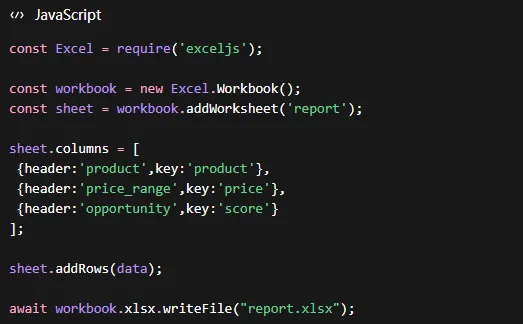 最后一步就是输出。用的是最简单的方法:node + exceljs。