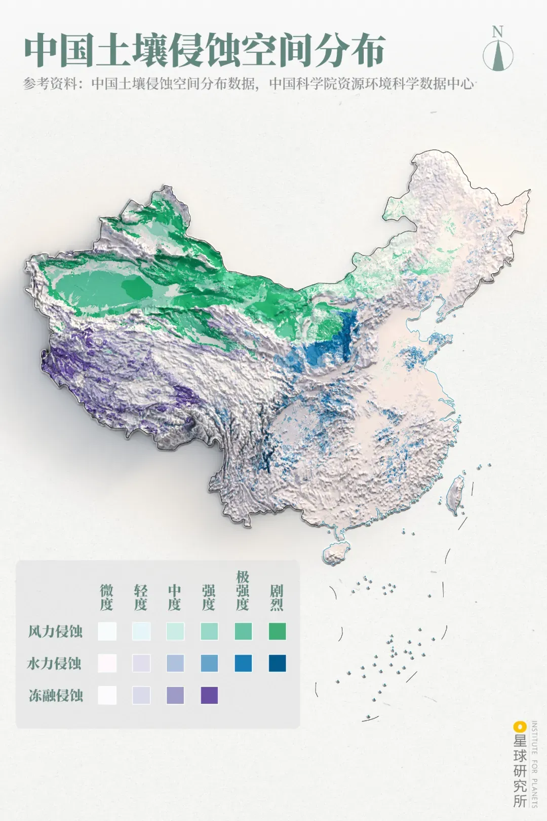 (2020年3月,甘肃张掖种植梭梭的人们,图片来源@视觉中国)(2020年中国森林分布,制图@巩向杰/星球研究所)(中国土壤侵蚀空间分布,制图@巩向杰/星球研究所)