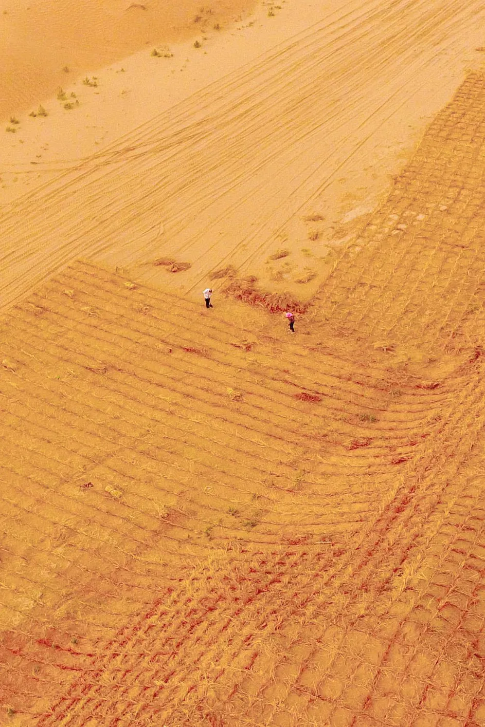 (请横屏观看,新疆巴州尉犁县境内,新疆的第三条沙漠公路——乌尉公路两侧扎起的草方格,图片来源@视觉中国)▼
