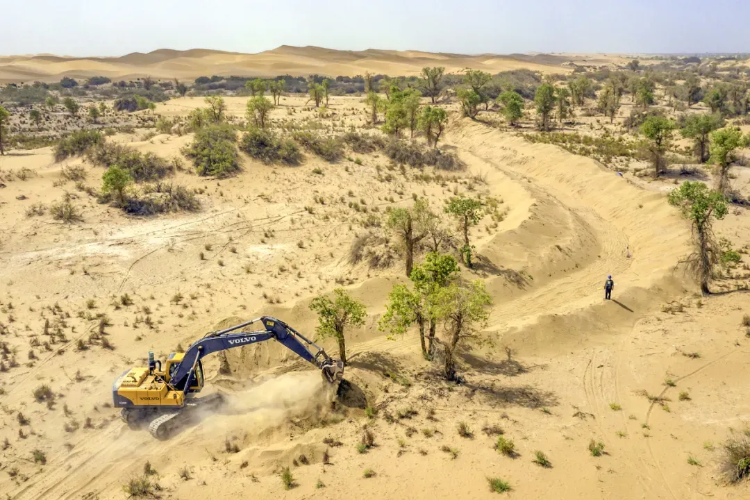 (2020年8月14日,新疆巴州,尉犁县林业和草原局护林员正在塔里木河中下游尉犁段开挖生态引洪渠,图片来源@视觉中国)
