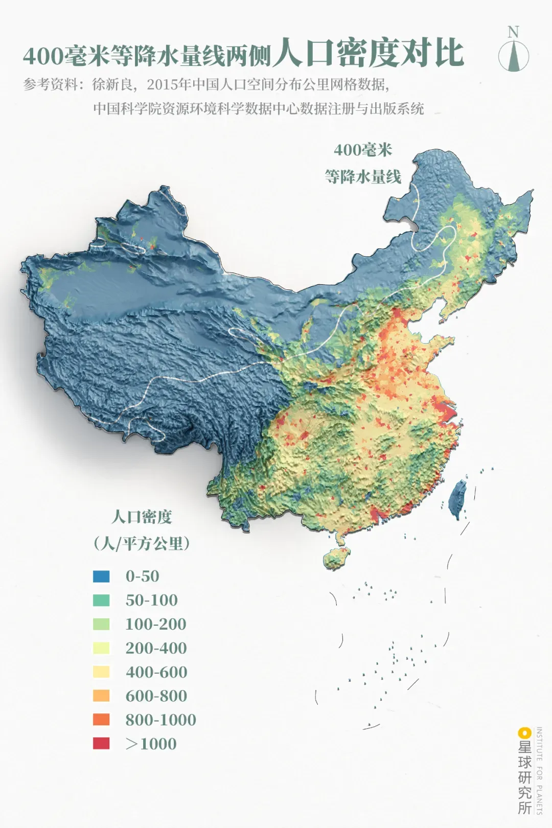 (400毫米等降水量线两侧人口密度对比,制图@巩向杰/星球研究所)