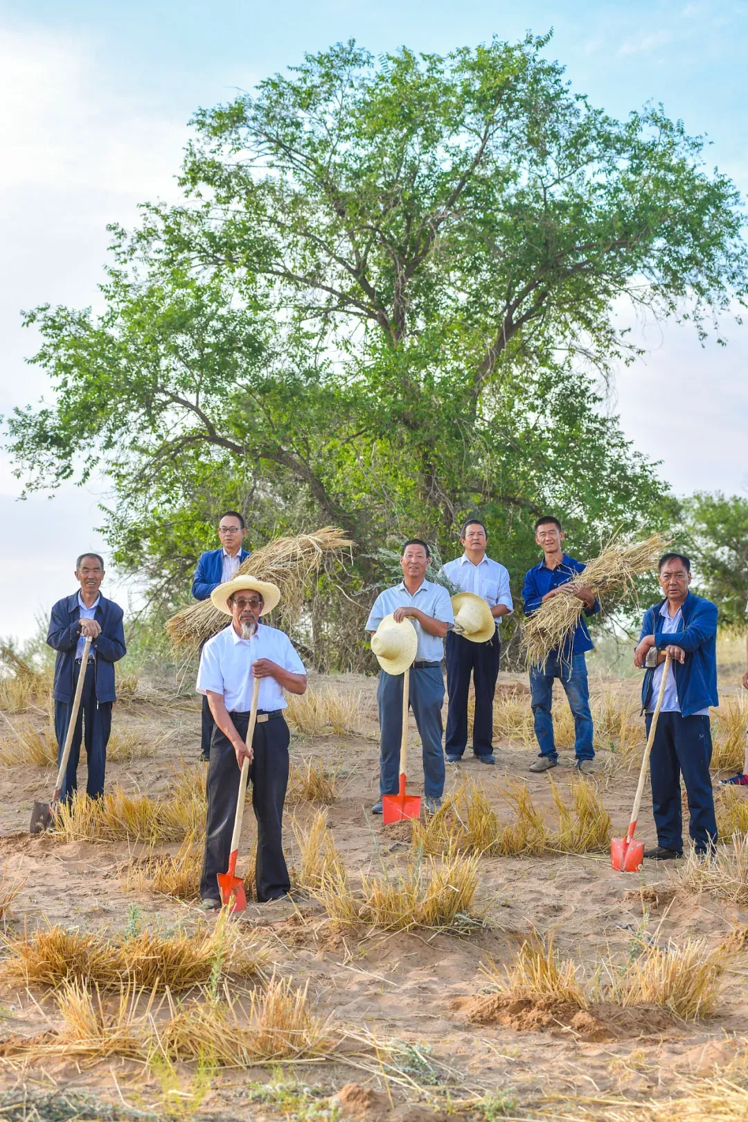 (2019年8月7日,甘肃武威古浪县八步沙林场,六老汉三代治沙人合影,图片来源@视觉中国)