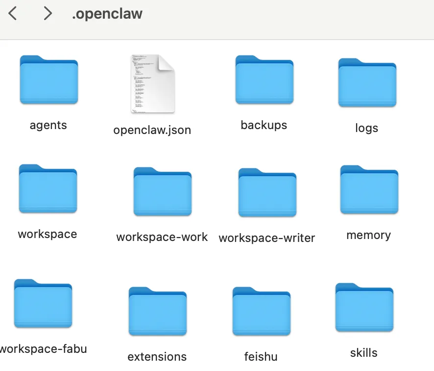 OpenClaw 支持多 Agent 协作,因此还有为每个agent专门设置的工作区,比如我的多agent工作区目录: