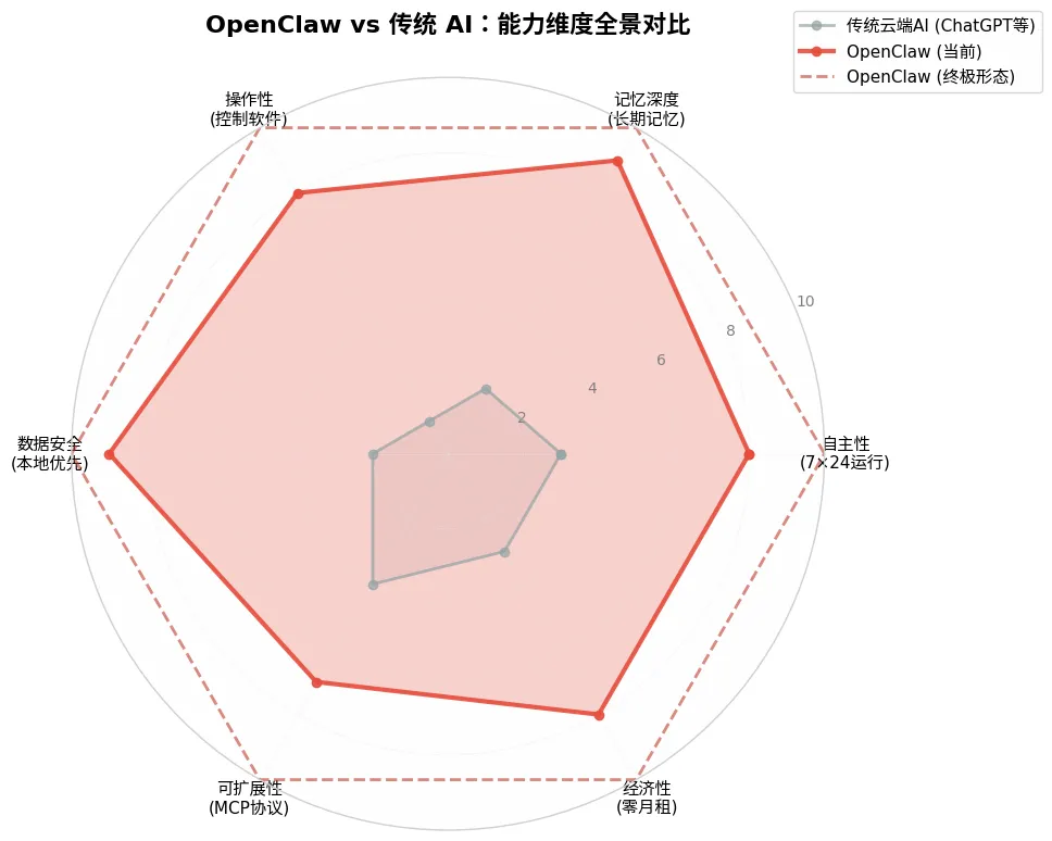 OpenClaw 在自主性、记忆深度、操作性等维度全面超越传统云端 AI