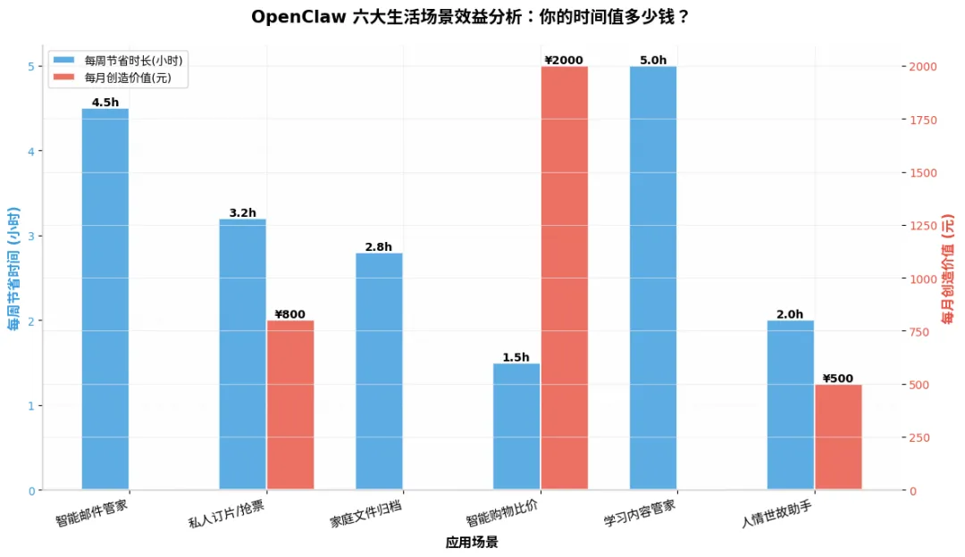 六大场景的时间节省与价值创造分析。学习内容管家每周节省 5 小时,智能购物比价每月创造价值 2000 元