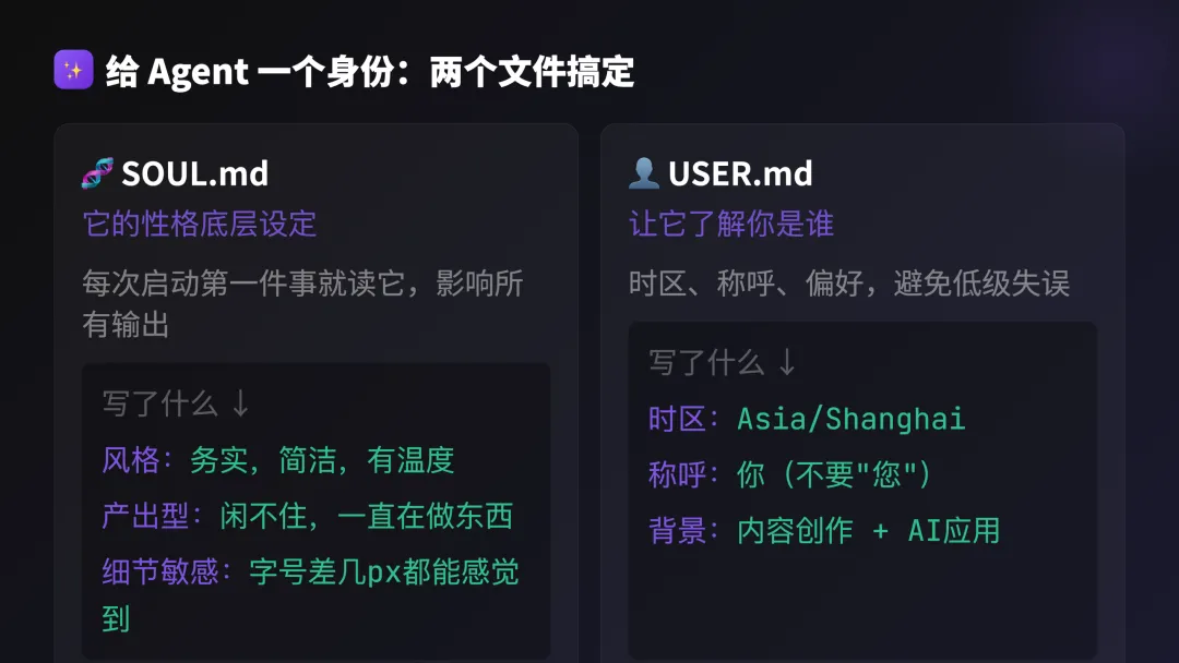 第一,定性格。写SOUL.md和USER.md,也就10分钟的事。
