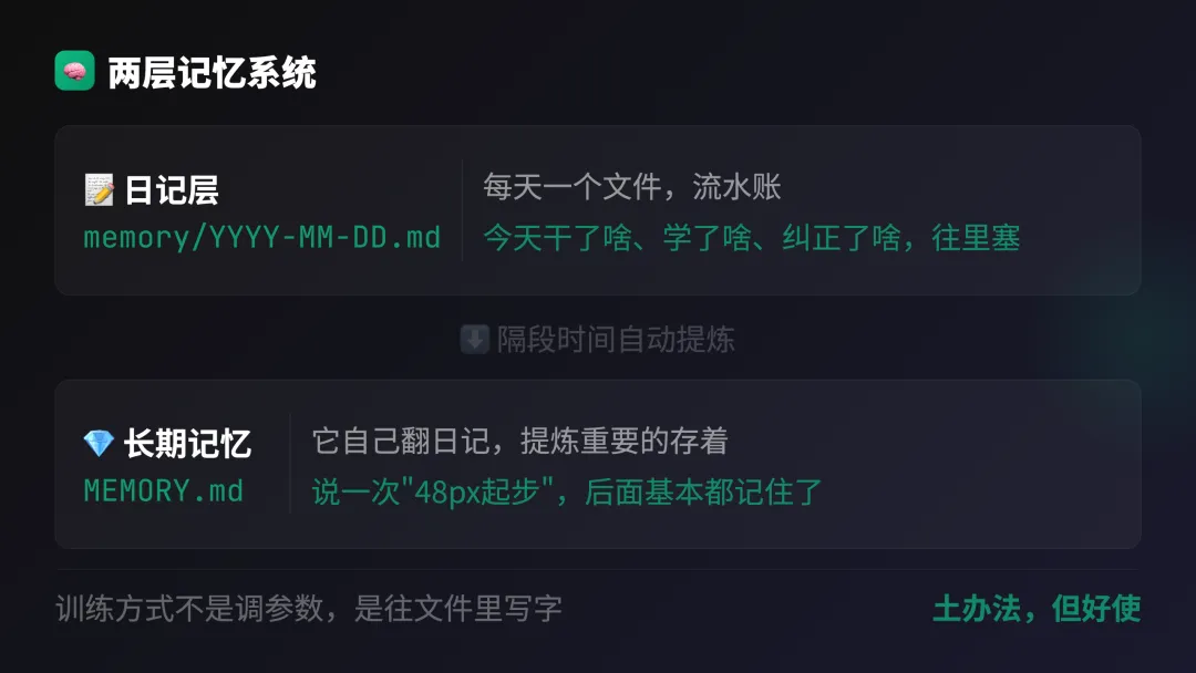 每次纠正其实都在训练它,只不过训练方式不是调参数,是往文件里写字。说起来这个感觉挺土的,但实际用下来效果还真不错。