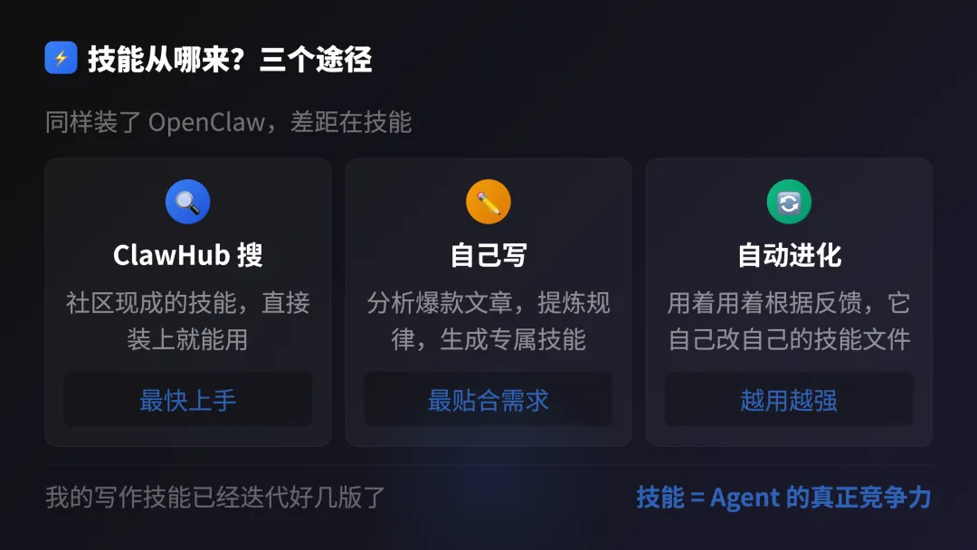 技能从哪来?大概三个途径。ClawHub上搜,现成的可以直接装。或者让它自己写,我就是先分析了不少爆款文章的写法,提炼出一些规律,然后让agent自己生成了个技能。再就是用着用着它自己会改,根据反馈去迭代,我这个写作技能到现在改了好几版了。